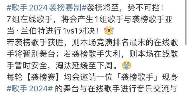 这一期是袭榜赛,官方也官宣了这个赛制,即是请来一位歌手遨游,只插足一期。采取一位歌手进行挑战,凯旋了就当期淘汰一位歌手,失败了就不淘汰。