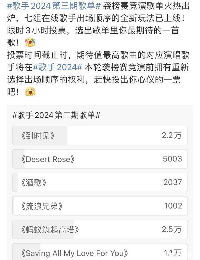 《歌手2024》第三期歌单也曾在官方曝光,网友驱动投票皇冠棋牌,投票第又名的歌曲演唱的歌手会有权先挑选出场端正。